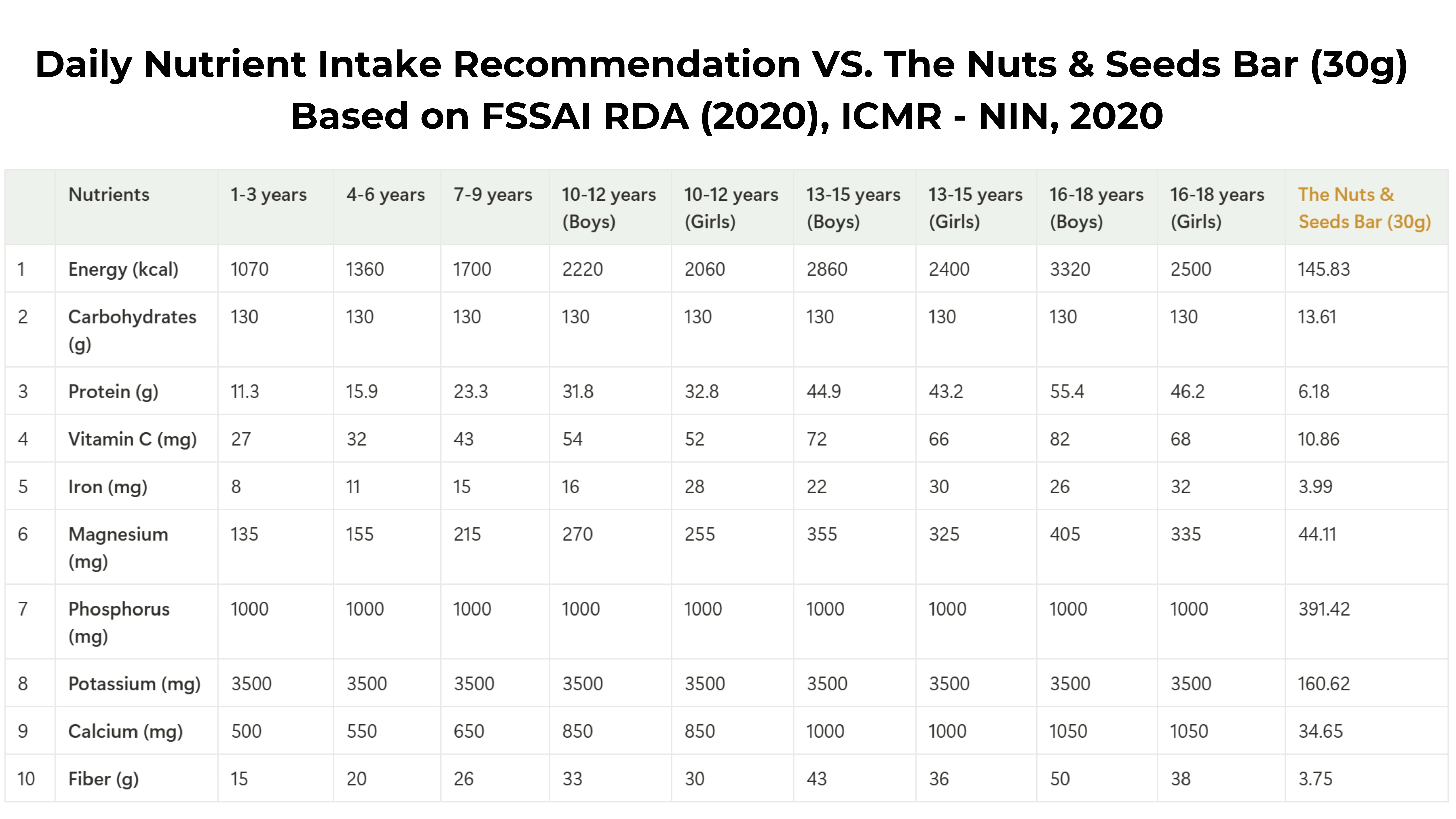After a physical activity, the body requires nutrients to replenish energy, repair muscles, and recover effectively. The Nuts & Seeds Bar is packed with protein, good fats, fiber and all essential nutrients, which provide sustained energy and support muscle repair. Eating it post-activity ensures the body absorbs nutrients efficiently for optimal recovery.